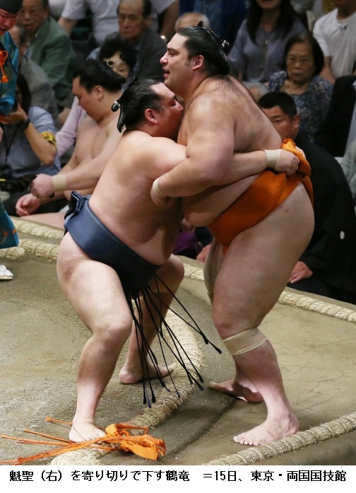 横綱 鶴竜に魁聖は鶴竜が寄り切りで勝って3連勝です。