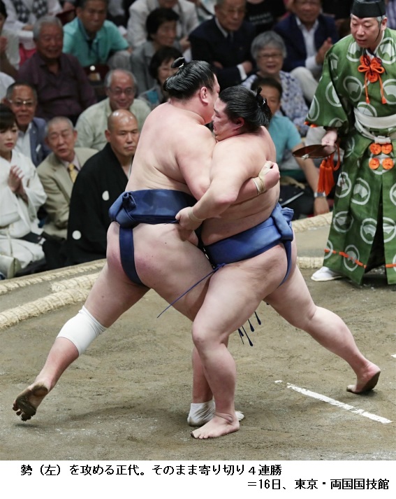 正代に勢は正代が寄り切りで勝って初日から4連勝です。