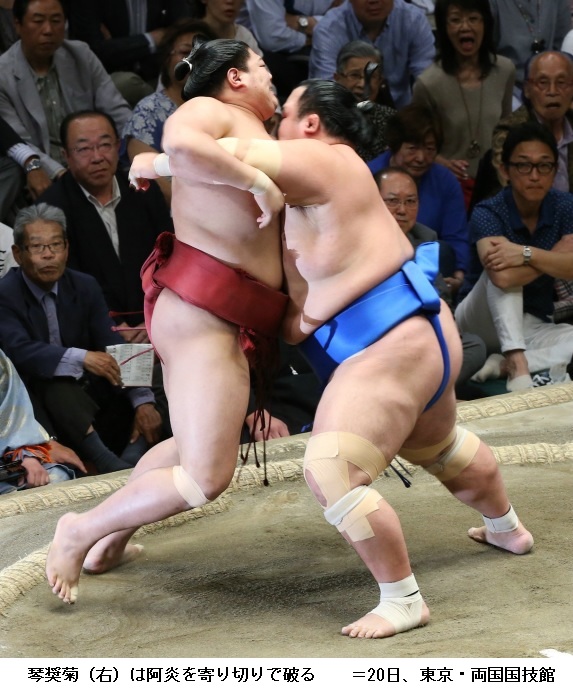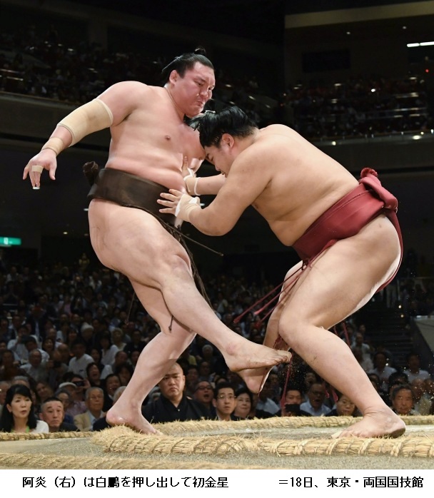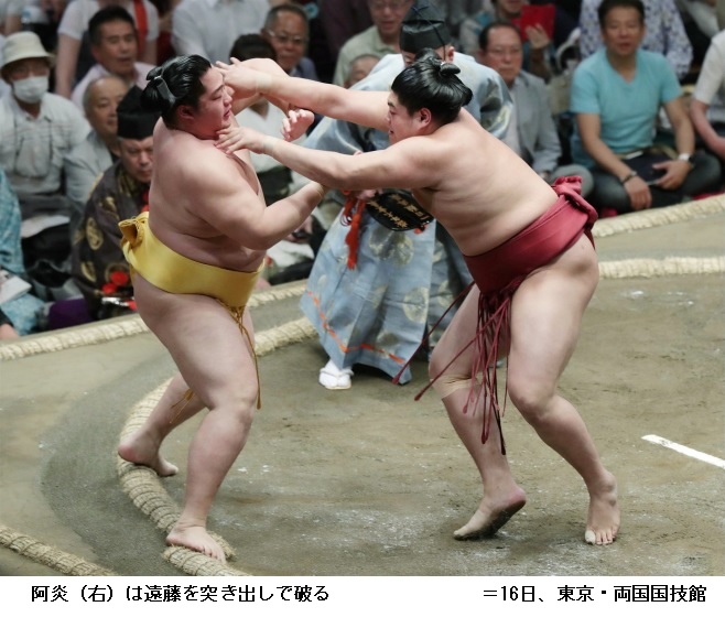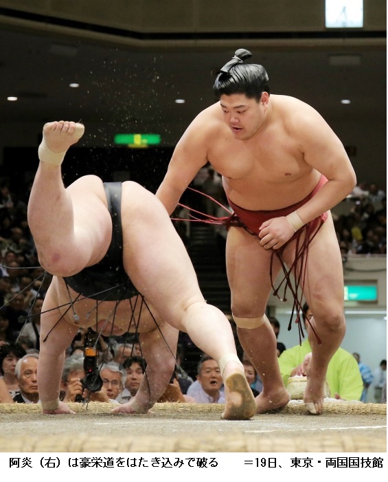 新小結の遠藤を持ち味の突き押しで破った阿炎は「疲れた。勝ててよかったです。がむしゃらでした。自分の間合いでとれてよかった」と笑顔で話していました。敗れた遠藤は、「やりづらかった」とだけ話し、後は無言でした。