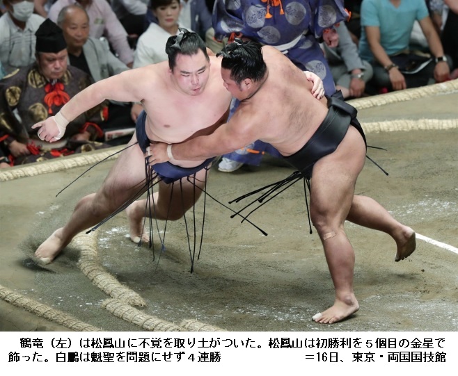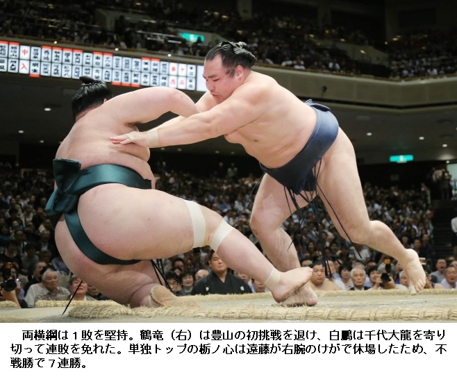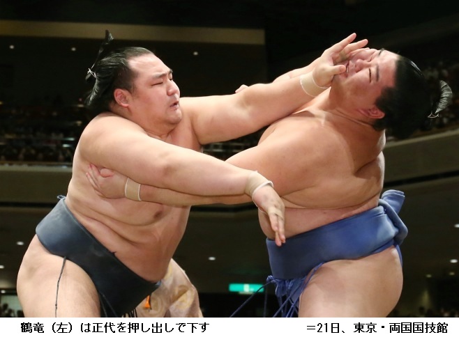 横綱・鶴竜から金星を挙げた松鳳山は、「よけいなことを考えずに我慢して前に出られてよかった。あしたも当たって突っ張って前に出たい」と笑顔を交え話していました。敗れた鶴竜は、「立ち合いがすべて。迷ったのがいけなかった。切り替えてやるしかない」と反省しきりでした。