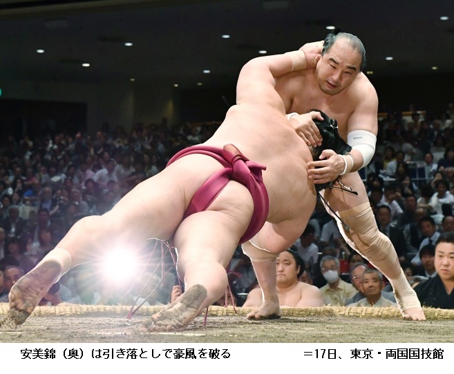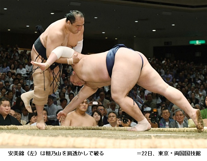 朝乃山に安美錦は、行司軍配差し違えで安美錦が肩すかしで勝ちました。