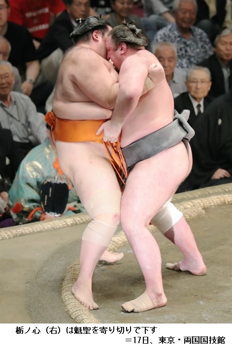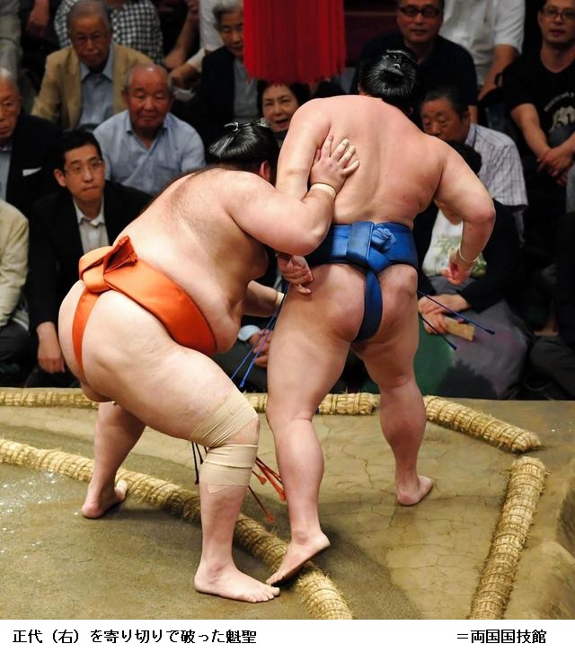大栄翔に魁聖は、魁聖が寄り切りで勝ちました。大栄翔は負け越しです。