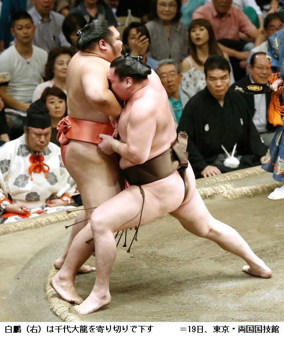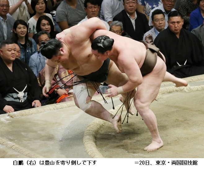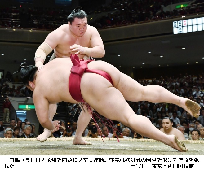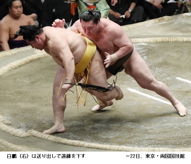 松鳳山に横綱 白鵬は白鵬が押し出しで3連勝。