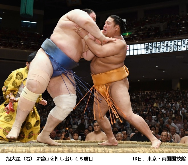 ベテランの安美錦をすそ払いでやぶり新入幕で初白星をつかんだ旭大星は「懸賞金は父に渡したい。狙っていたわけじゃないけど足が勝手に出た。連勝したいですね」と笑顔で話していました。