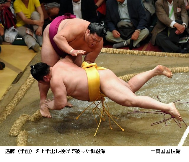 勢に御嶽海は、御嶽海が突き落としで勝ちました。