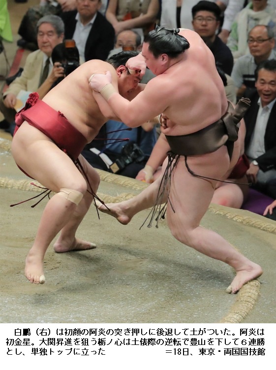 大相撲夏場所2日目 栃ノ心ほか上位陣は安泰 ―― 大相撲夏場所は東京 両国の国技館で2日目の取組が行われ、大関昇進を目指す関脇 栃ノ心は、新鋭の阿炎を寄り切りで破り、2連勝スタートです。
