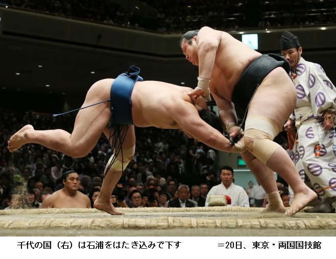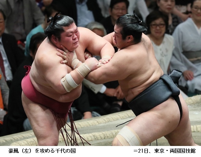 豪風に千代の国は、千代の国が突き出しで勝ちました。千代の国は勝ち越しです。