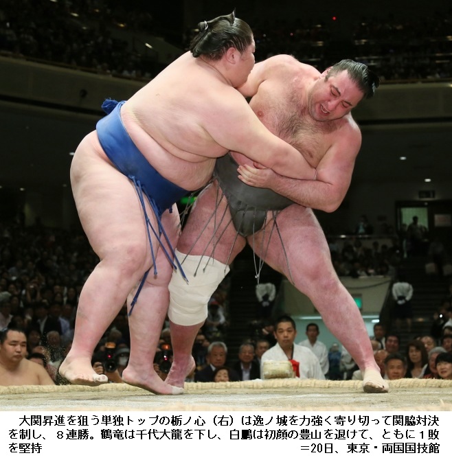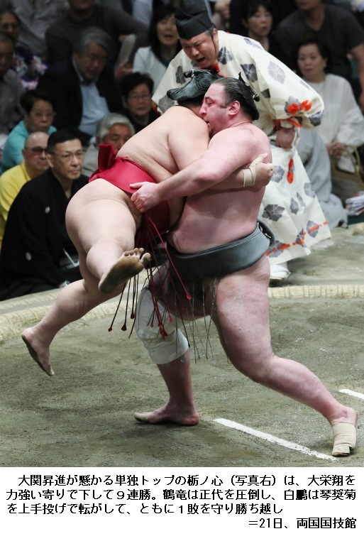 大相撲夏場所9日目 栃ノ心が9連勝 ―― 大相撲夏場所は東京・両国の国技館で9日目の取組が行われ、大関昇進を目指す栃ノ心は、大栄翔に勝って9連勝となりました。