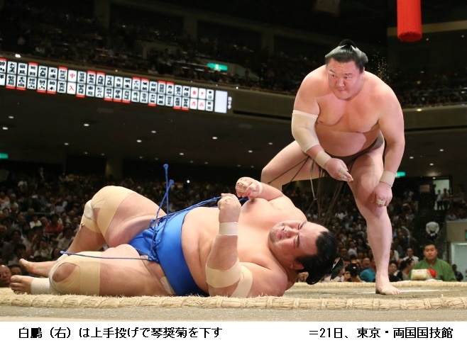 琴奨菊に横綱 白鵬は、白鵬が上手投げで勝ちました。