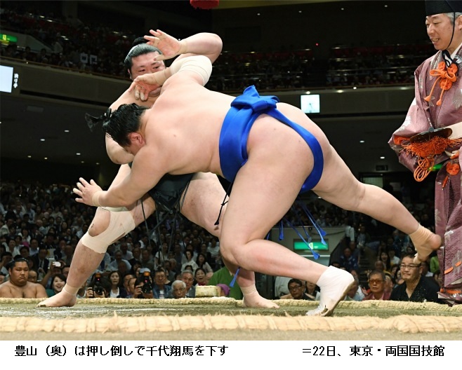 豊山に千代翔馬は、豊山が押し倒しで勝ちました。豊山は初白星です。