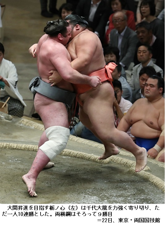 大相撲夏場所10日目 栃ノ心が10連勝 ―― 大相撲夏場所は、東京 両国の国技館で10日目の取組が行われ、関脇の栃ノ心は千代大龍に勝って10連勝とし大関昇進にまた1歩近づきました。
