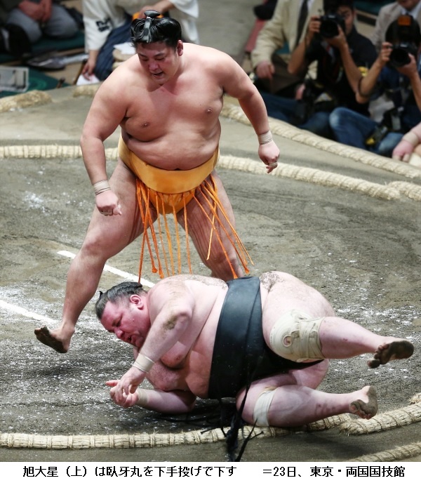 十両の臥牙丸に旭大星は、旭大星が下手投げで勝ちました。旭大星は新入幕で勝ち越しを決めました。