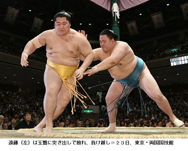 玉鷲に遠藤は、玉鷲が突き出し。遠藤は新小結の場所で負け越しが決まりました。