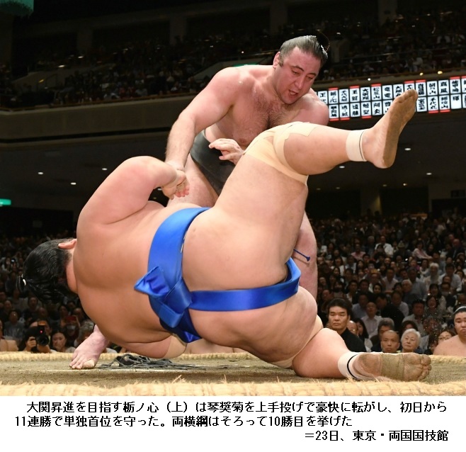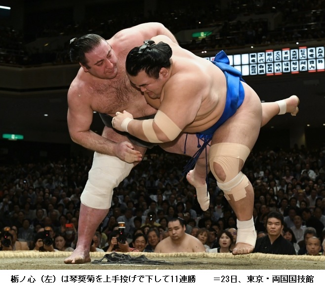 栃ノ心に琴奨菊は、栃ノ心が上手投げで勝ちました。栃ノ心は11連勝で、ここ3場所の勝ち星の合計が大関昇進の目安とされる33勝を2つ上回る35勝となり、大関昇進に大きく近づきました。