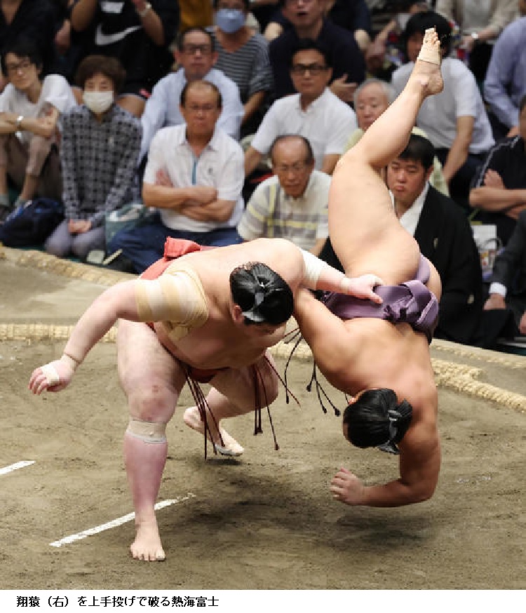 右差し狙いで立った翔猿の作戦が、逆に熱海富士には幸いした。あっけなく左上手を引くと、一呼吸置いてすぐ、引きつけながら前に出て、左から強烈な上手投げで三役力士を豪快に転がした。