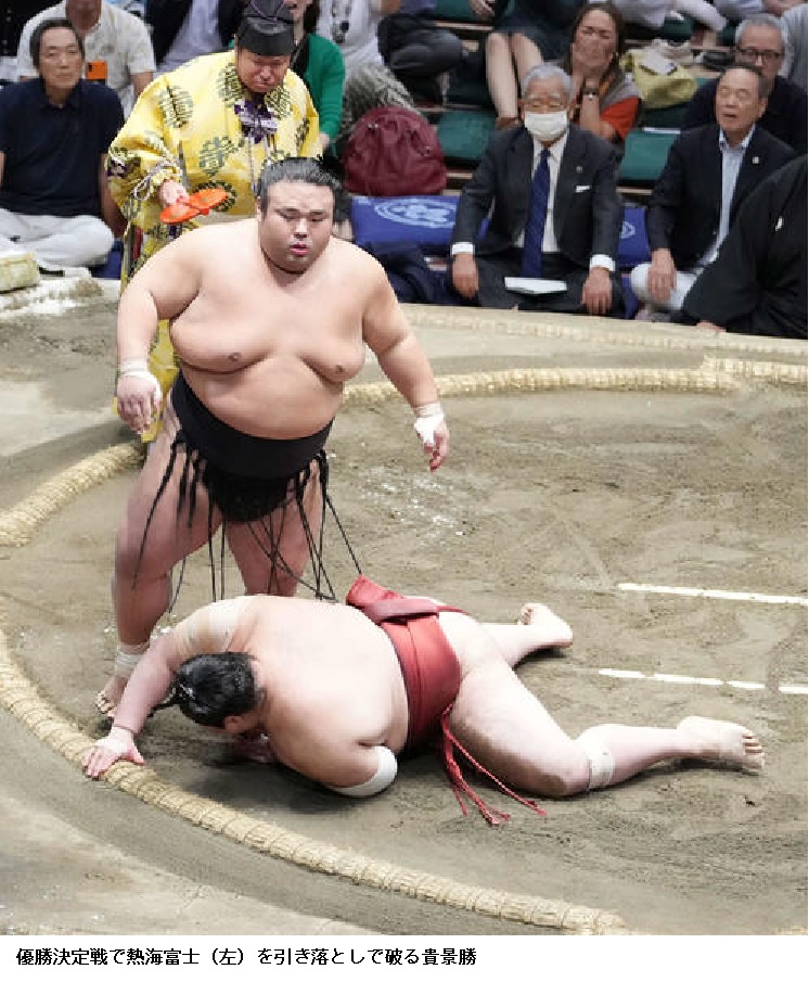 報道陣の取材に対応した日本相撲協会の八角理事長(元横綱北勝海)は、冷静にこの一番を分析。「普通にやれば、これが力の差でしょう」と切り出した。立ち合いからの流れは「立ち合いから押されていない。押し込んでいる」と熱海富士の善戦を評価しつつ、21歳の挑戦を受けた貴景勝について「よく足を送っている。初めての相手だから、いつものように、いっぺんに押すのでなく、見て行った感じだった」と話した。これで両者がトップに並んだが、勝った貴景勝が残り2日に大関戦を残すことから「貴景勝は明日からの方がしんどいでしょう」とし、「優勝争いがこの2人に絞られたか?」の問いにも「絞られたとは言えない」。優勝ラインが4敗に下がることも含め、残り2日に波乱が起こる可能性をにおわせた。