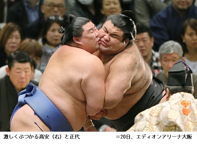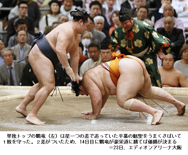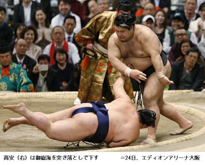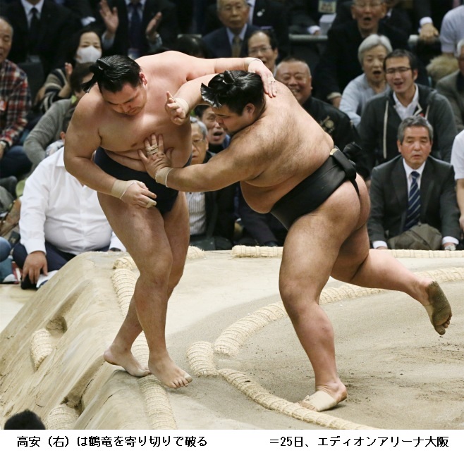 この結果、春場所の優勝争いは鶴竜が1敗でトップに立ち、2敗で魁聖、3敗で高安と豪栄道の両大関、平幕の大翔丸と勢の4人が追う展開となりました。