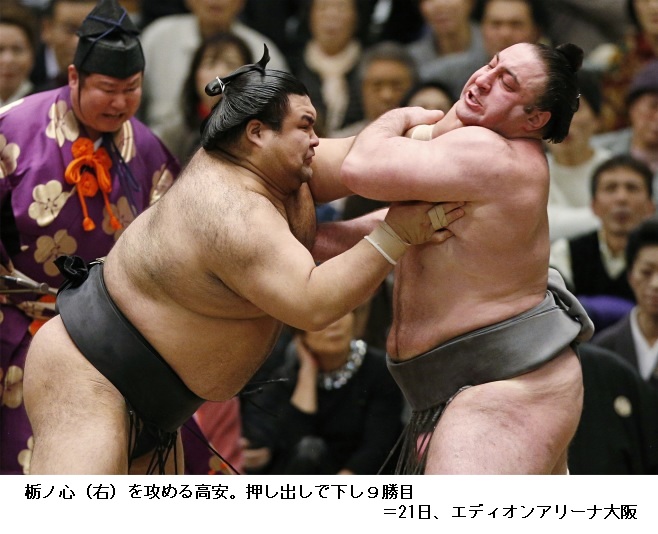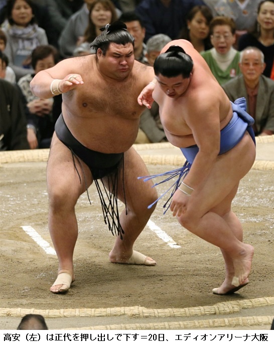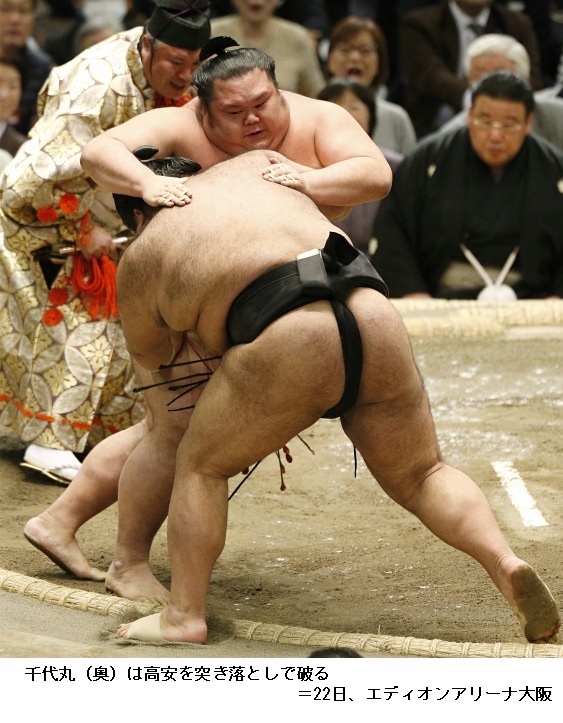 千代丸に2敗の大関・高安は、千代丸が突き落としで勝ちました。高安の連勝は9で止まり9勝3敗に後退です。