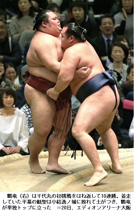大相撲春場所10日目 魁聖が敗れ全勝は鶴竜1人に ―― 大相撲春場所は大阪市の大阪府立体育会館で10日目の取組が行われ、横綱 鶴竜は勝って10連勝としましたが、平幕の魁聖は敗れ1敗に後退し、幕内での勝ちっ放しは鶴竜1人となりました。