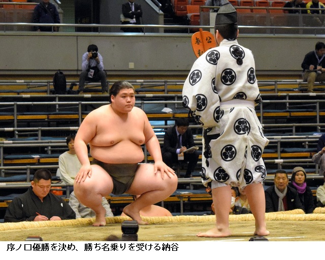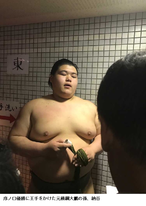 納谷 序の口V王手 大物感漂わせ「元々Vする気でいた」 ―― 大相撲春場所11日目が行われ、元横綱・大鵬(故人)の孫で序ノ口18枚目の納谷(17=大嶽部屋)が全勝を守った。三段目経験のある序ノ口筆頭の夏野登岩(かやといわ、26=湊部屋)との全勝対決を制して単独トップに躍り出た。