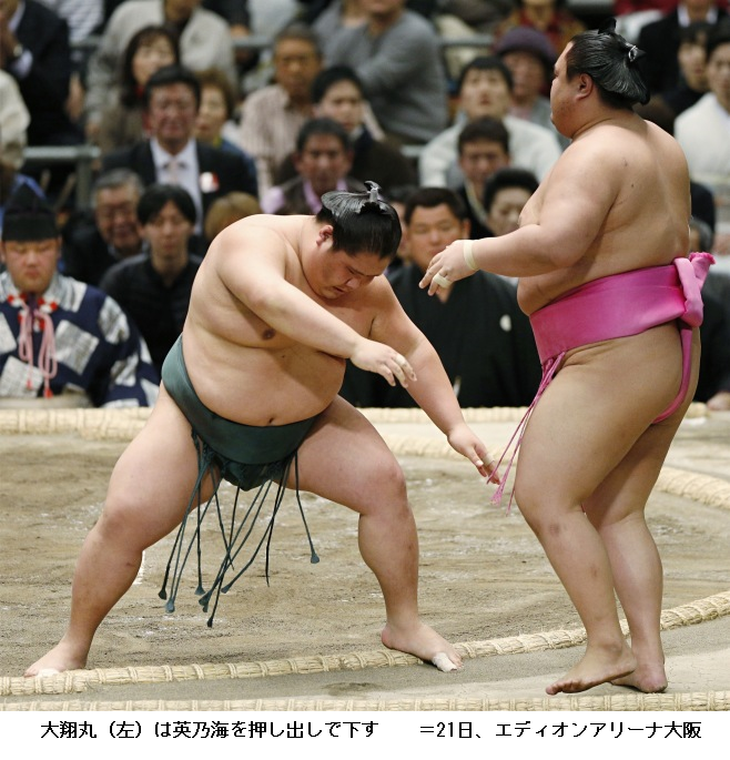 大翔丸に英乃海は、大翔丸が押し出しで勝ち越し。