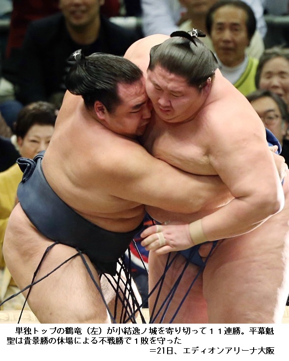 大相撲春場所11日目 横綱 鶴竜が11連勝 魁聖は不戦勝 ―― 大相撲春場所は、大阪市の大阪府立体育会館で11日目の取組が行われ、ただひとり全勝の横綱 鶴竜は逸ノ城を寄り切りで破り11連勝としました。1敗で追う平幕の魁聖は、貴景勝の休場による不戦勝で10勝1敗となり、星の差1つは変わりません。