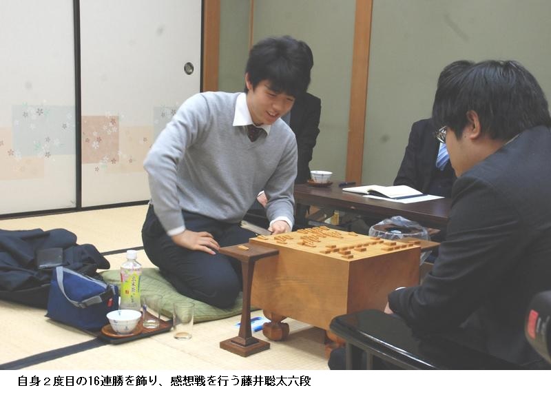 午前10時に始まった対局は午後6時に終局した。終局後、藤井六段は報道陣の取材に応じ、「初めて指した形で、ちょっと感覚がつかめていなかった。早い段階で形勢を損ねてしまった」と反省。連勝が止まったことについては、「仕方が無いことかな、と思います。まずは、(本局の)内容の方をしっかり反省したい」と述べた。