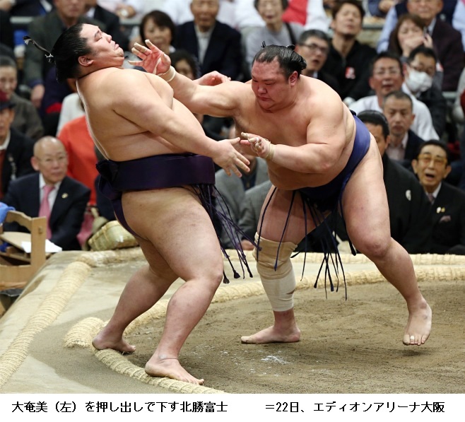 北勝富士に大奄美は、北勝富士が押し出し。
