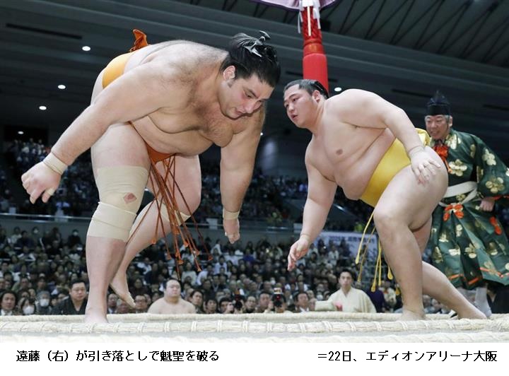 1敗の魁聖に遠藤は、遠藤が引き落としで勝ちました。魁聖は立ち合いからまっすぐ押して出ました。遠藤の引き技をいったんはこらえましたが土俵際を回りこまれ、再び前に出たところをタイミングよく引かれ土俵を割りました。これで魁聖は10勝2敗に後退です。