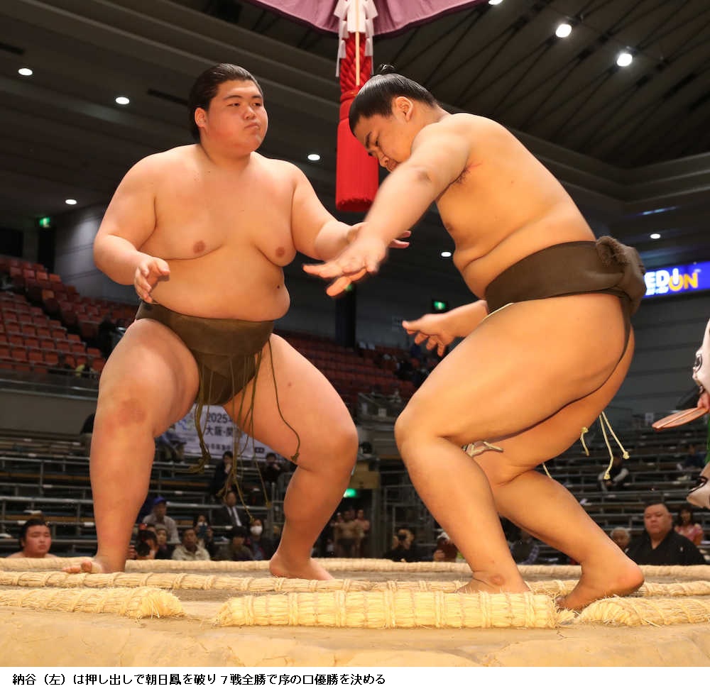 立ち合いで横へ動いた相手に突っ込んで大きな体で一気に前に出て吹っ飛ばした。夏野登岩が土俵下に落ちると「ゴ〜ン」という鈍い音が場内に響いた。涼しい顔の納谷は「きょうもしっかり攻めれた。全然問題ない」と余裕しゃくしゃく。優勝に王手をかけ「優勝は元々する気できた。一番一番、自分の相撲を取れれば」と意欲を見せた。 [スポニチアネックス 2018年3月21日 10:00 ]
