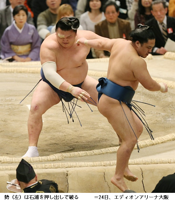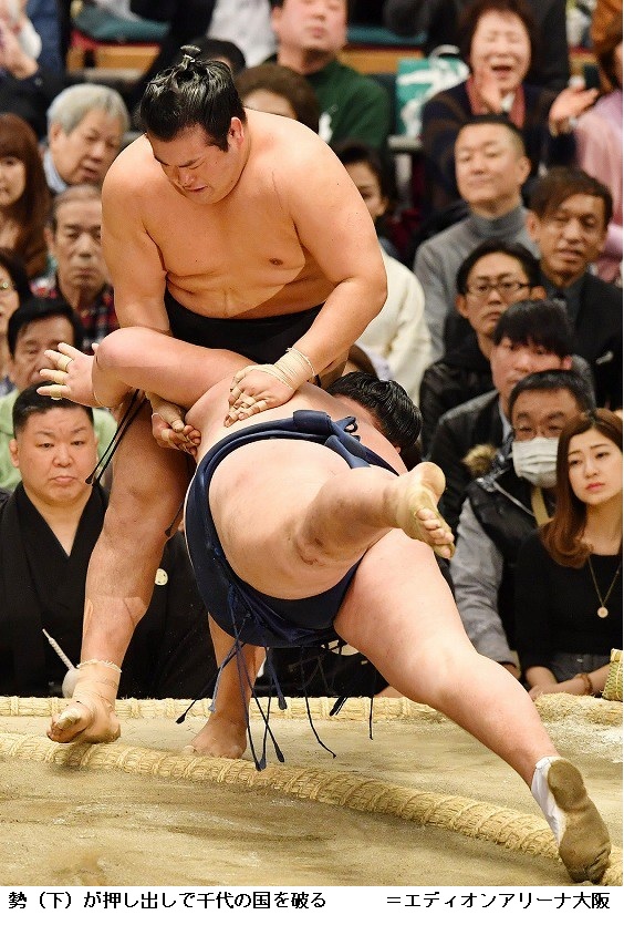 勢に隠岐の海は、勢が引き落としで勝って勢も9勝目です。