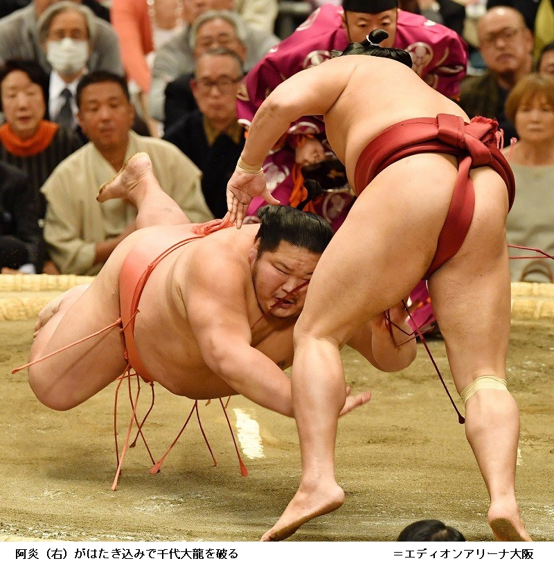 阿炎に大翔丸は、阿炎がはたき込みで勝って10勝めをあげました。