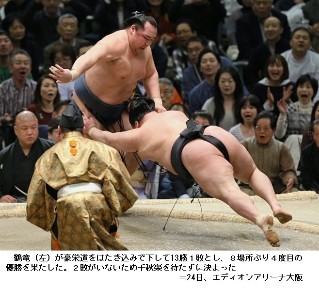 春場所千秋楽 優勝の鶴竜は敗れ13勝2敗に ―― 大相撲春場所は大阪市の大阪府立体育会館で千秋楽の取組が行われ、24日に8場所ぶり4回目の優勝を決めた横綱 鶴竜は大関 高安に敗れ、13勝2敗で春場所を終えました。中入り後の勝敗です。