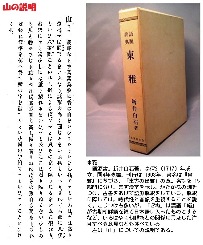 広辞苑などによる山の語源についてはいくつかの説がありますが、山の「ヤ」は「高き義」「重なり積もれる」ことをいい、「マ」は「限り隔たりぬる」こと、一定の間隔があることを指すという新井白石の「東雅」の説に沿った解釈を採用しています。
