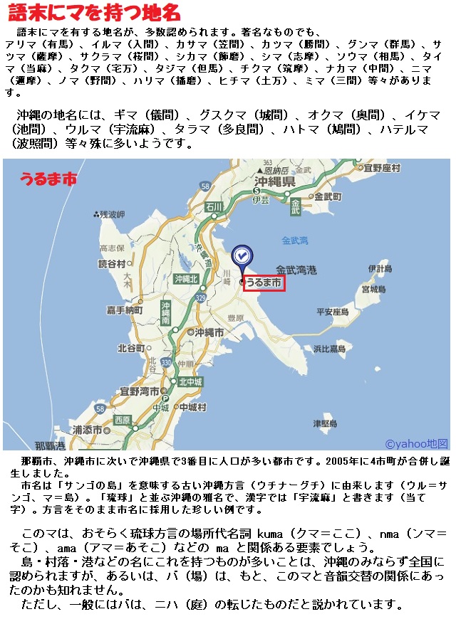 例えば、ハマ(浜)、ヌマ(沼)、シマ(島)、クマ(隈=山や川が曲がりこんだところ。また、奥まったところ)などと言う記号を比べ合わせてみますと、これらは皆ある地整、又は地形の名であり、そして共通に、「マ」という要素を第二音節に持っています。すると、この「マ」という要素が地形を意味し、「ハ」・「ヌ」・「シ」・「ク」などの要素が、それぞれの地形の違いを示すものであったのではないかということになります。もしそうだとすれば、ヤマもまた、「ヤという名でよばれるマ(地形)」という意味でつけられた名ではなかったか、というような推定を降すことが出来ます。