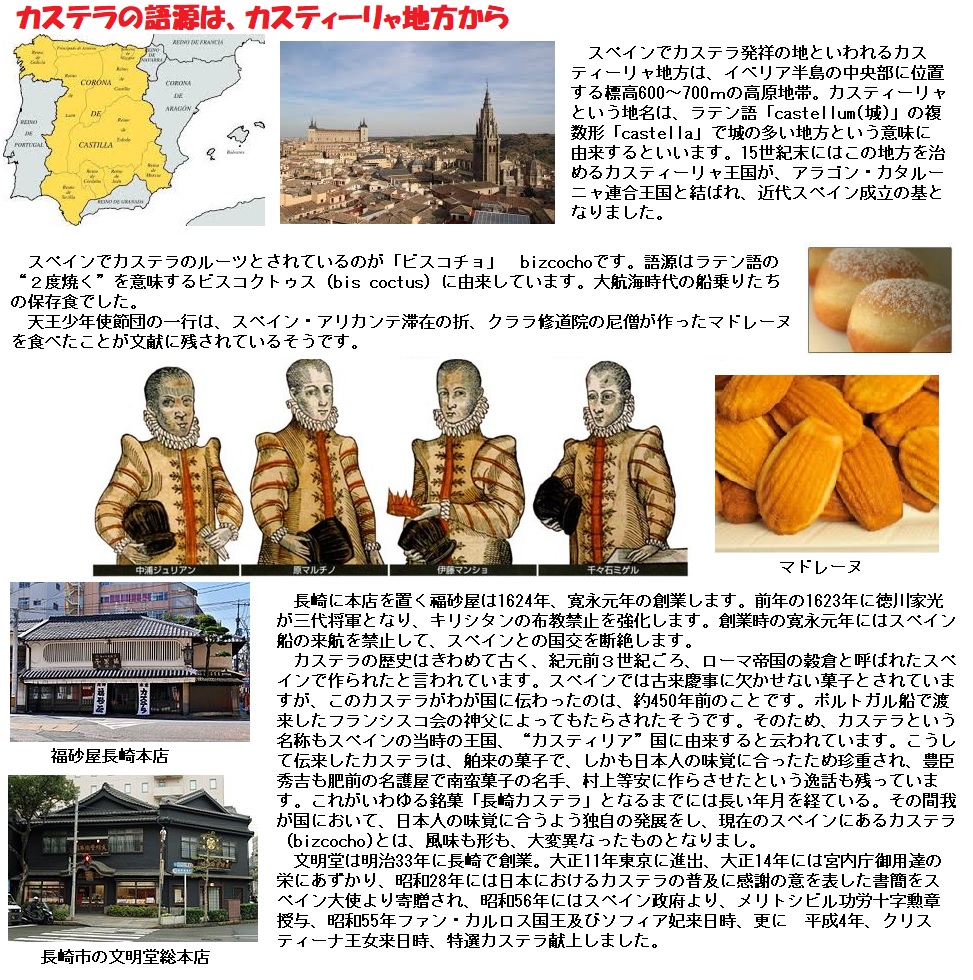 カステラは、ポルトガル語 pão de Castela (パン・デ・カスティーリャ=スペインのカスティーリャ王国のパン)にする説が有力ですが、あるいはオランダ語 Castiliaan brood (カスティリア・ブロート)によるとも言い、さらには、オランダ語 kasteel(城)によるもので、この菓子が初めて長崎に持ち込まれた時、日本人がその名を訊ねたところ、これを入れた箱(一説には、これを載せた皿)にたまたま城の絵が描いてあったので、訊ねられたオランダ人は、その絵のことを聞かれたものだと勘違いして、「カスティール(城)」と答えたため、それがこの菓子の名になってしまったのだ、という説が行われたこともあるといいます。