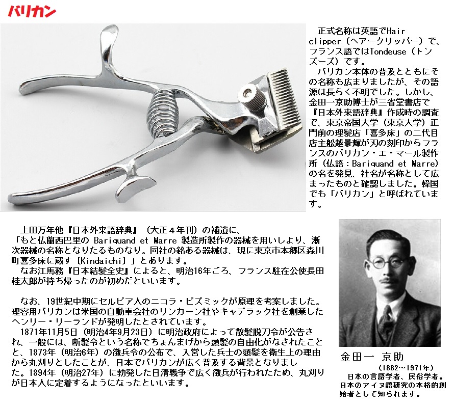これは事実らしく、こうなると、バリカンの語源説明は、純粋に言語的な問題ではなくて、一種の文化史上の事件に求められなくてはならなくなります。