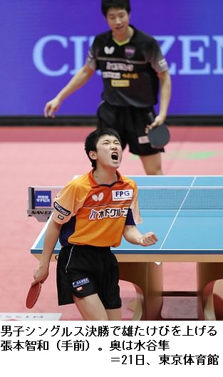 男子決勝は張本と、2016年リオデジャネイロ五輪メダリストで5年連続10度目の優勝を狙った水谷隼(木下グループ)の対戦。果敢に攻めの卓球を貫いた張本が4-2で快勝し、昨年大会の女子シングルスを16歳で制した平野美宇(エリートアカデミー)の最年少記録を塗り替えた。