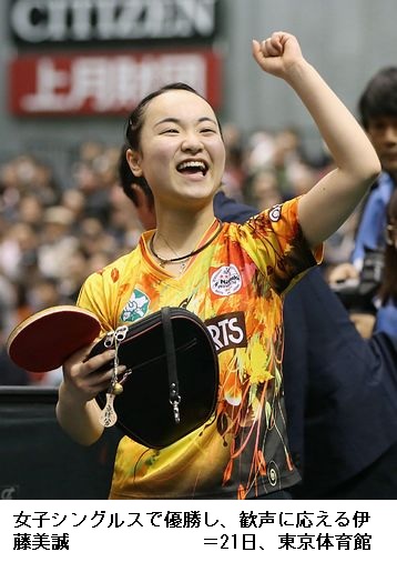 14歳張本、最年少優勝=女子は17歳伊藤が3冠-全日本卓球 ―― 卓球日本一の座を争う全日本選手権は21日、東京体育館で最終日の男女シングルス決勝が行われ、男子は中学2年で14歳の張本智和(エリートアカデミー)、女子は17歳の伊藤美誠(スターツ)がともに初優勝を果たした。張本は男女を通じて史上最年少優勝。女子ダブルス、混合ダブルスも制した伊藤は、女子で史上最年少となる3冠に輝いた。