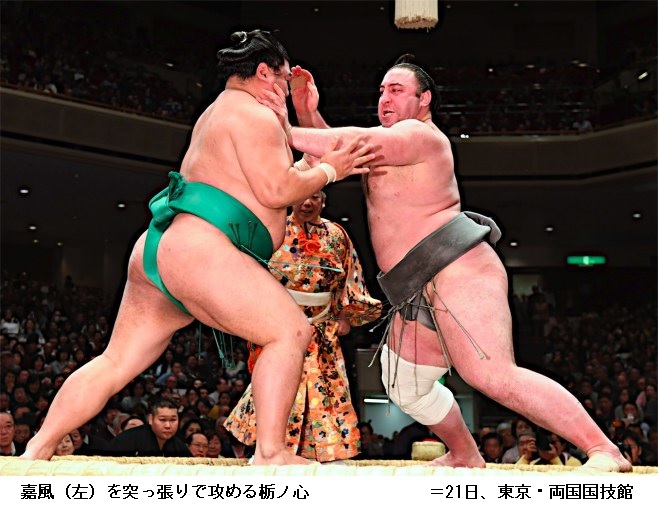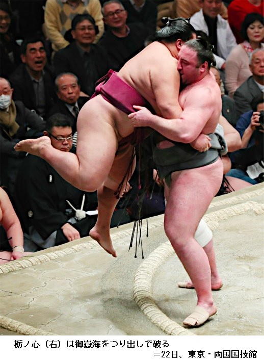 嘉風に栃ノ心は、栃ノ心が突き出しで勝ちました。栃ノ心は7勝目です。