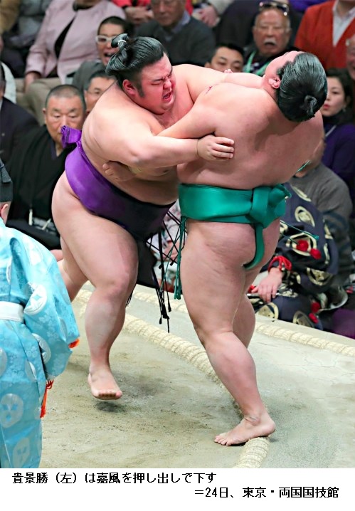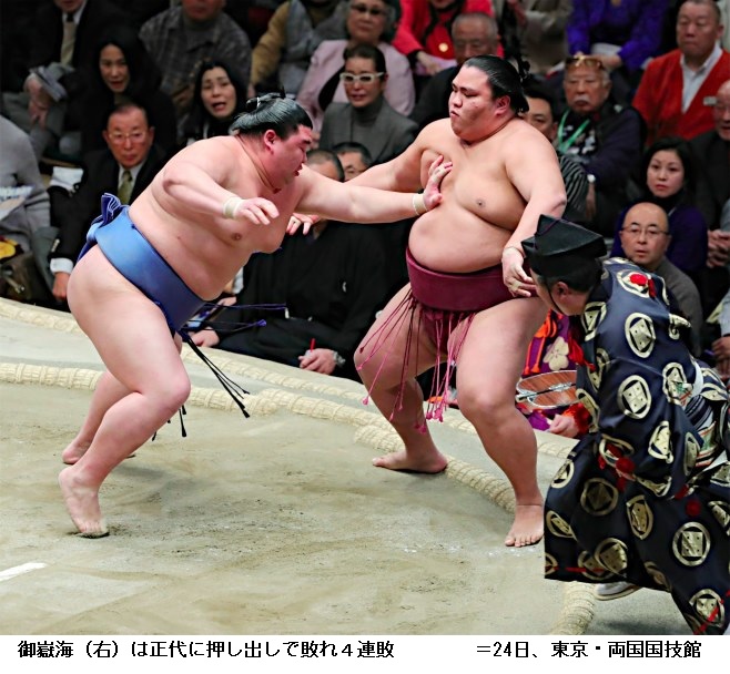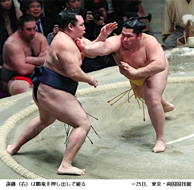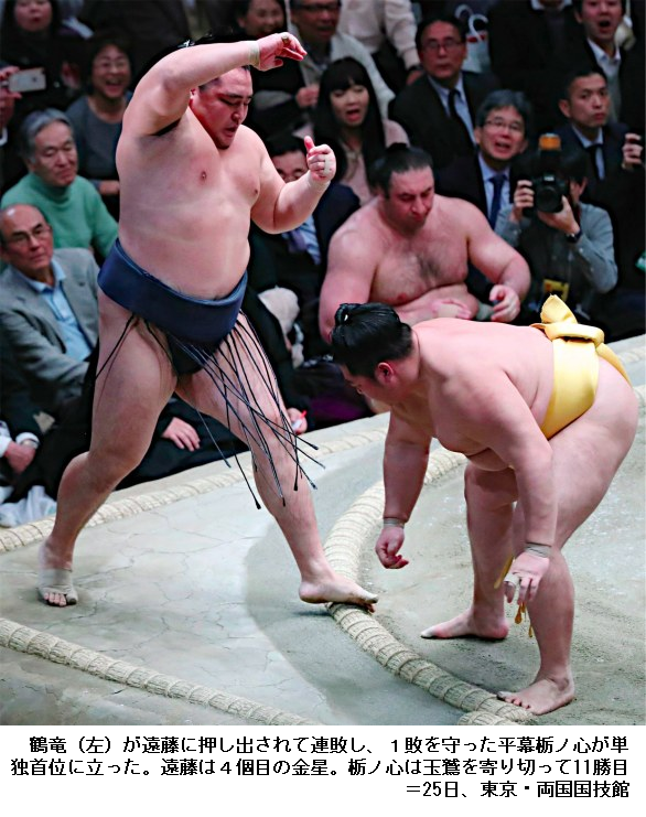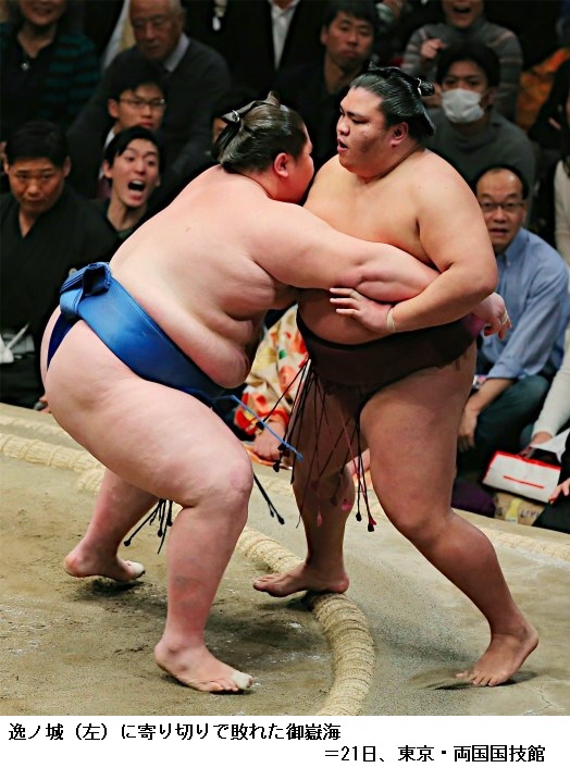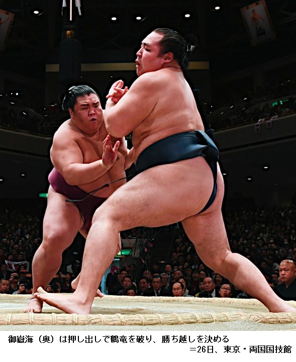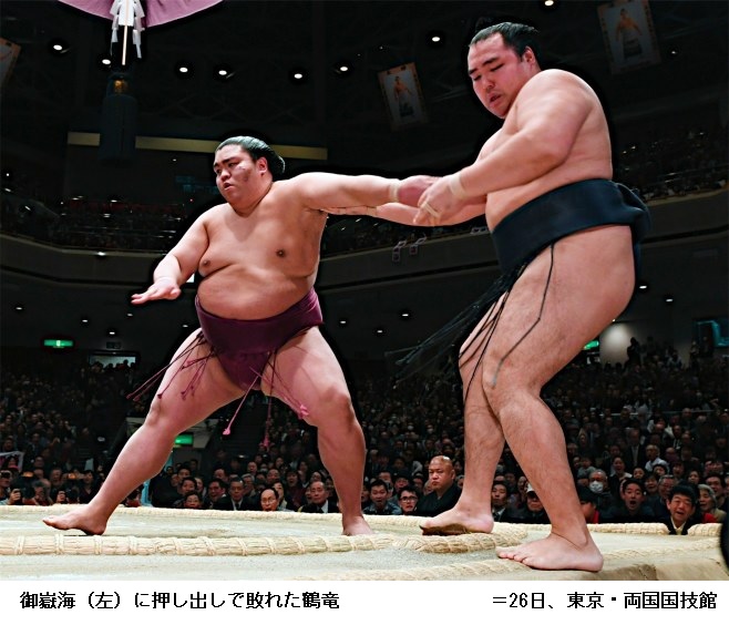 横綱・鶴竜に御嶽海は、御嶽海が押し出しで勝ちました。鶴竜は3連敗で3敗となり、優勝争いから後退しました。