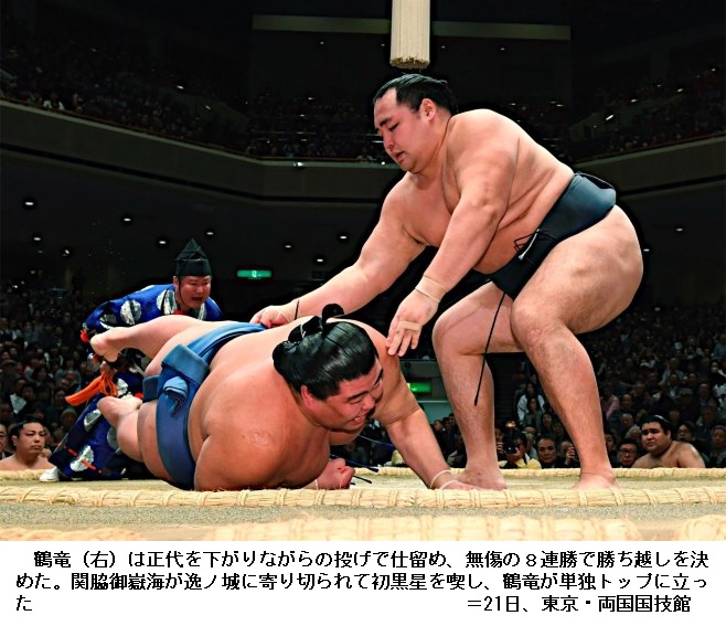 横綱・鶴竜に正代は、鶴竜が上手出し投げで勝ちました。鶴竜は、ただ1人8連勝で勝ち越しを決めました。
