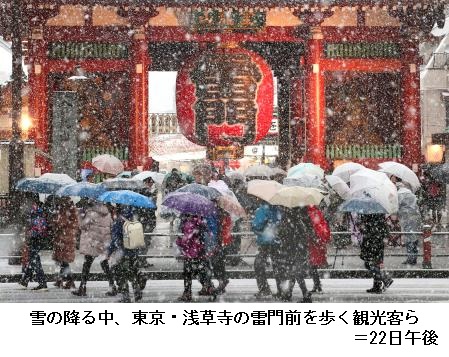 首都圏で大雪、交通混乱 東京都心4年ぶり20センチ超 ―― 日本列島南岸を進む低気圧の影響で、首都圏では22日昼ごろから大雪となり、列車の運休や遅れが相次ぐなど、交通機関に大きな乱れが出た。降雪のピークが帰宅時間帯と重なり、複数の駅で入場規制が実施され、周辺は帰宅を急ぐ人たちであふれた。23日にかけても雪が予想され、気象庁は注意を呼び掛けている。