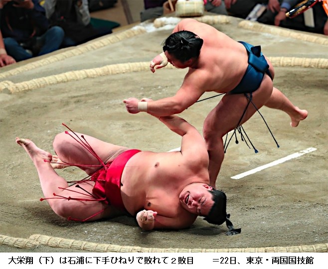 石浦に大栄翔は石浦が下手ひねり。大栄翔は2敗目です。
