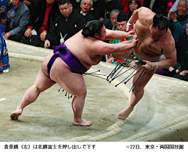 北勝富士に千代大龍は千代大龍が突き出し。北勝富士は負け越しです。