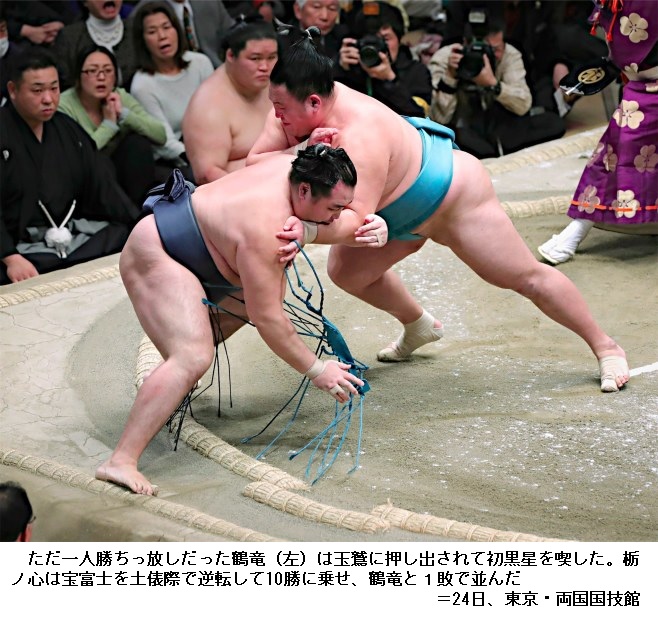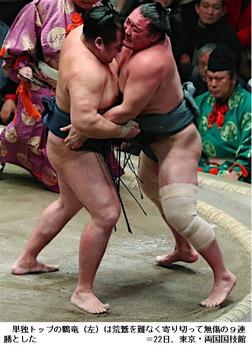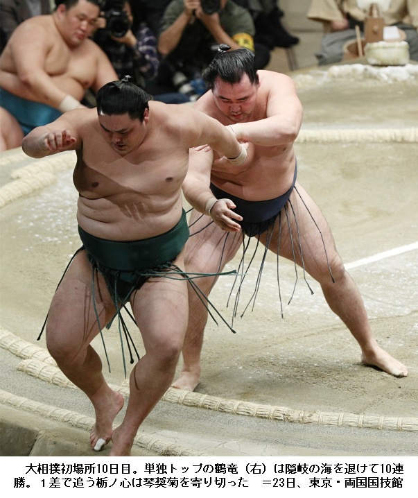 初日からただ1人、10連勝の鶴竜は「きょうは胸を合わせず、相手にまわしを取らせないことを心がけた。いい流れの相撲だった。体がよく反応している。波に乗っていきたい」と落ち着いて話していました。 (NHK NEWS WEB 1月23日 18時33分大相撲)