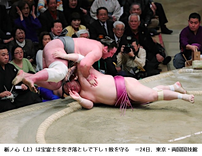 大相撲初場所13日目 栃ノ心 1敗守る 鶴竜は3敗 ―― 大相撲初場所は13日目の取組が東京・両国の国技館で行われ、優勝争いの単独トップに立つ平幕の栃ノ心が勝って1敗を守りました。2敗の横綱・鶴竜は敗れて3敗に後退したため、栃ノ心は27日に勝てば初めての優勝が決まります。