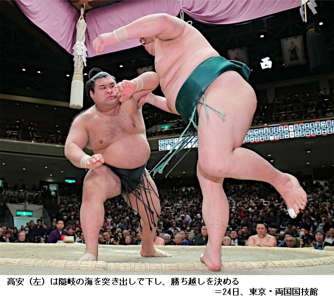 御嶽海に大関・高安は高安が上手投げで勝ちました。高安は12勝3敗でした。
