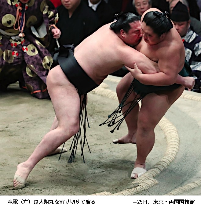 蒼国来に竜電は蒼国来が寄り倒しで勝ちました。