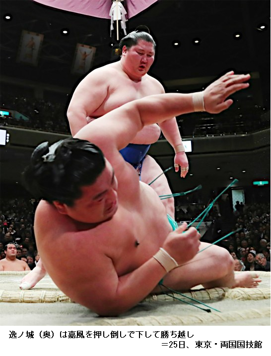 御嶽海に逸ノ城は、逸ノ城が寄り切り。御嶽海は今場所、初黒星です。